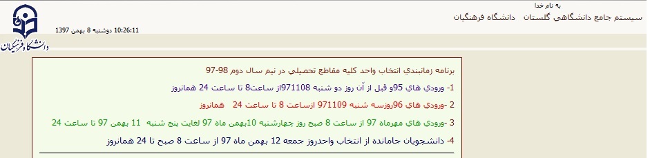زمان انتخاب واحد از مورخه 1397/11/08 لغایت 1397/11/12 می باشد دانشجویان ملزم به انتخاب واحد از یک گروه پیشنهادی هستند.