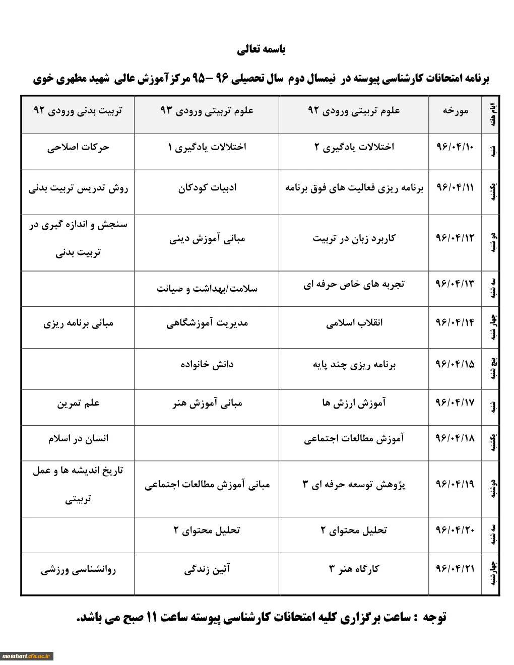 برنامه امتحانات کارشناسی پیوسته ناپیوسته در نیمسال دوم سال تحصیلی 96 - 95 مرکزآموزش عالی شهید مطهری خوی 2