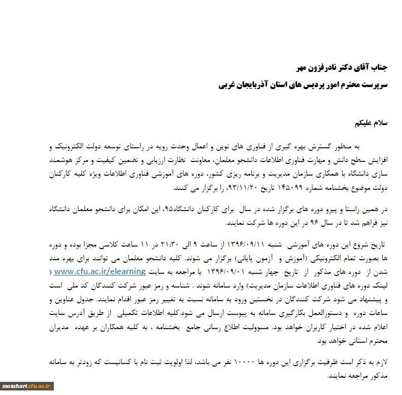 امتیاز دهید : ثبت نام و شرکت در دوره های آموزشی فناوری اطلاعات (دانشجو معلمان) 2 شنبه 20 آبان 1396 ساعت 9:39