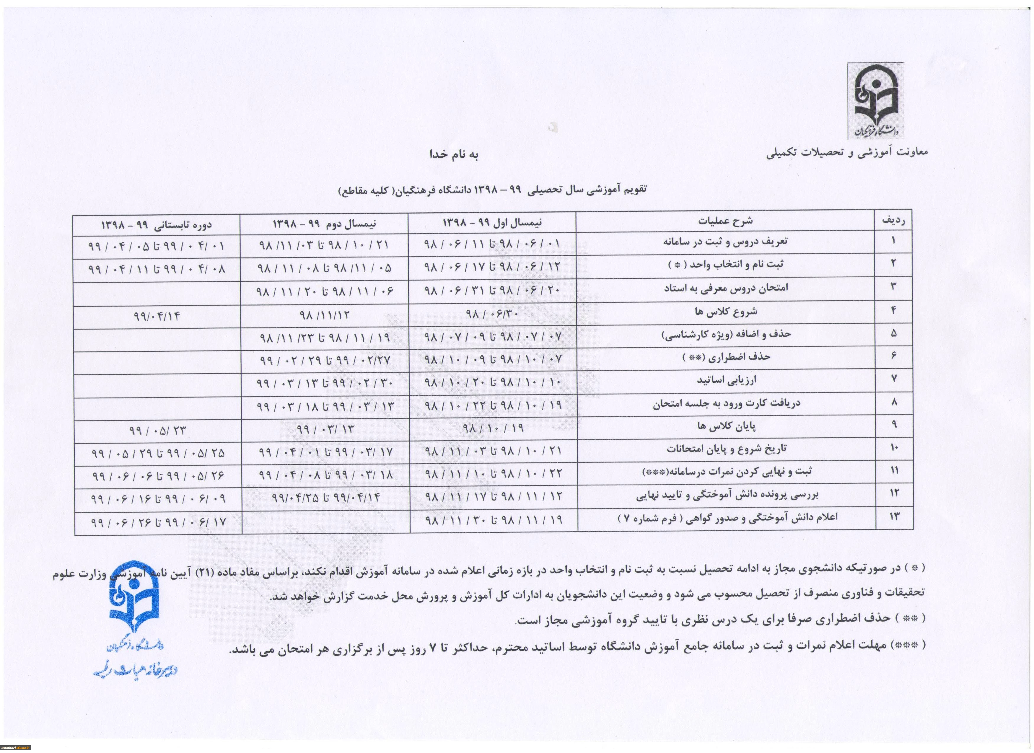 قابل توجه دانشجویان محترم تقویم آموزشی سال تحصیلی 99-98 دانشگاه فرهنگیان 2