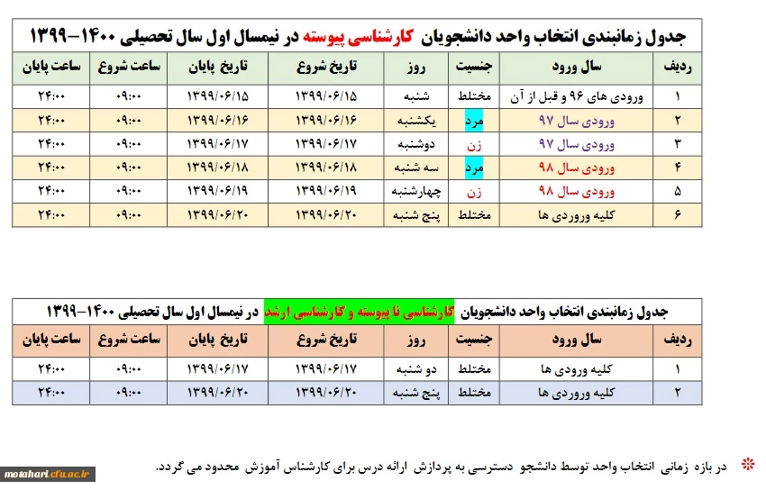 اطلاعیه مهم آموزشی جدول زمانبندی انتخاب واحد دانشجویان کارشناسی پیوسته در نیمسال اول سالتحصیلی ۱۴۰۰_۱۳۹۹ 2