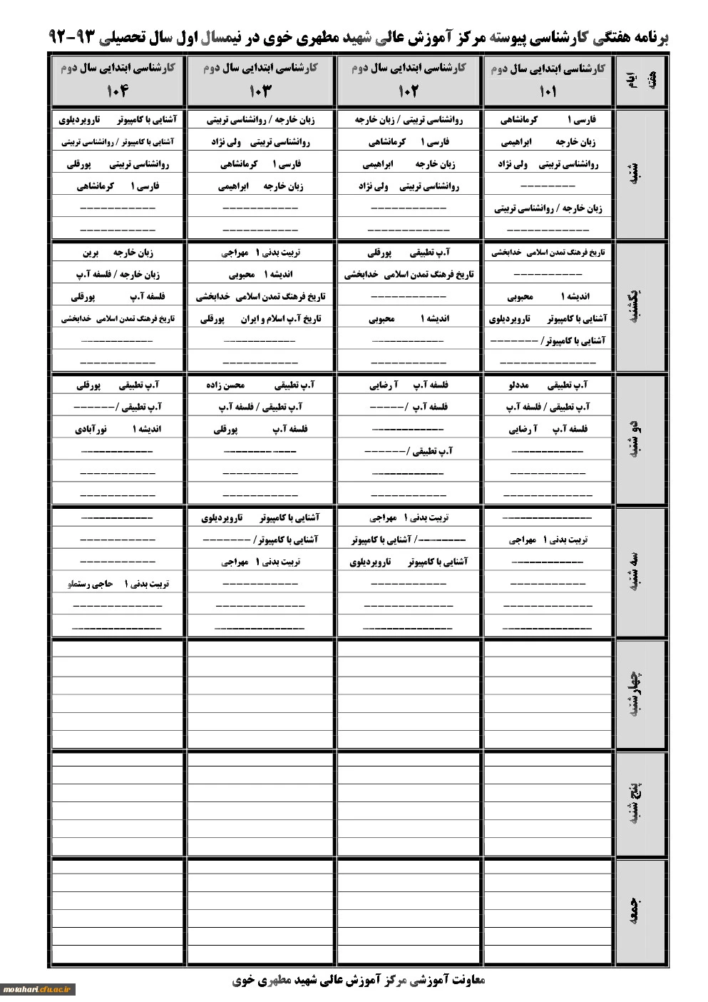برنامه هفتگی آموزش عالی شهید مطهری کارشناسی پیوسته اول 93-92